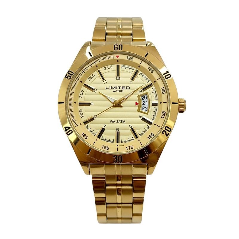 RELOJ LIMITED WATCH B026 PARA CABALLERO, BRAZALETE DE ACERO INOXIDABLE COLOR DORADO CON FONDO DORADO CON LÍNEAS HORIZONTALES, AGUJAS DORADAS PARA HORA, MINUTO Y SEGUNDO. DETALLES NÚMERICOS EN SU BISEL